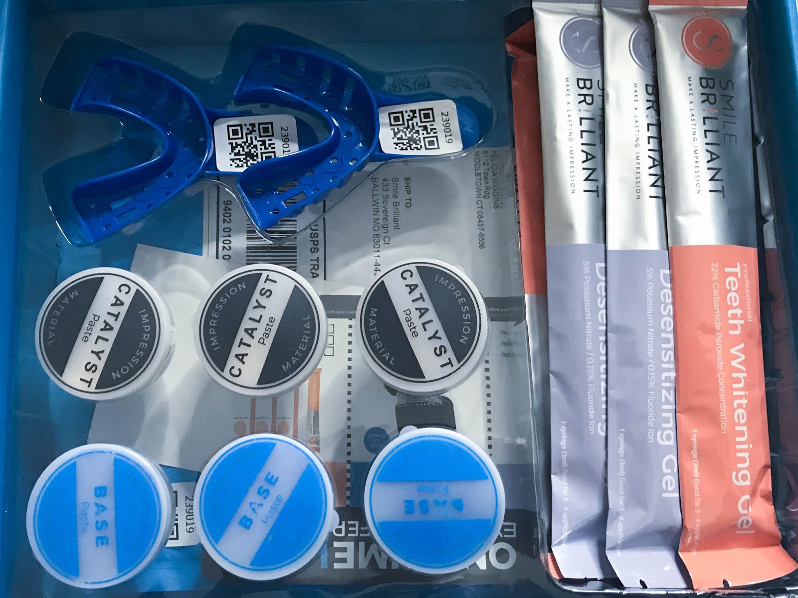 Before starting the process the company sends you a clay mold and impression trays to fit both your upper and bottom teeth outlines to use for the treatment.