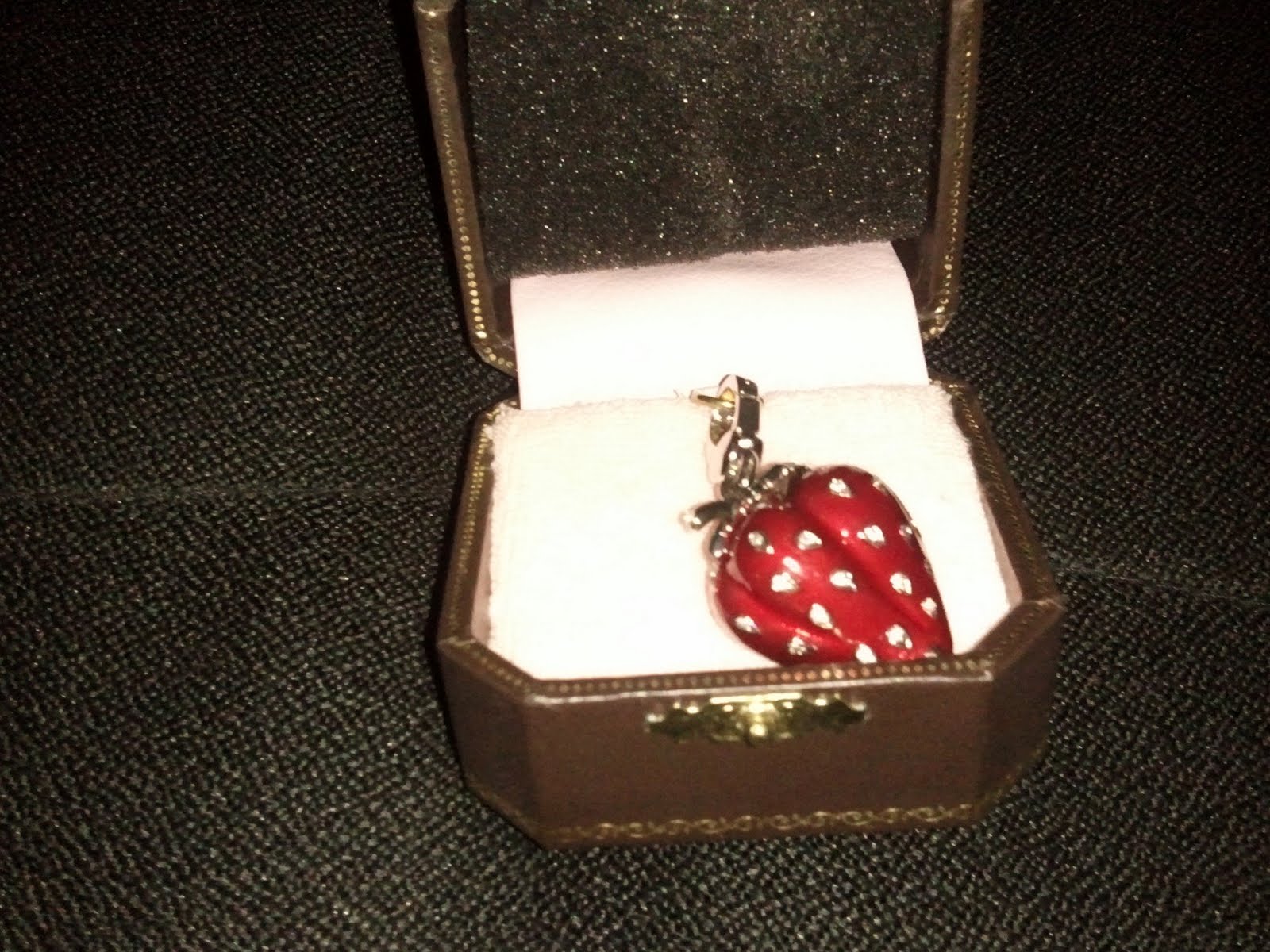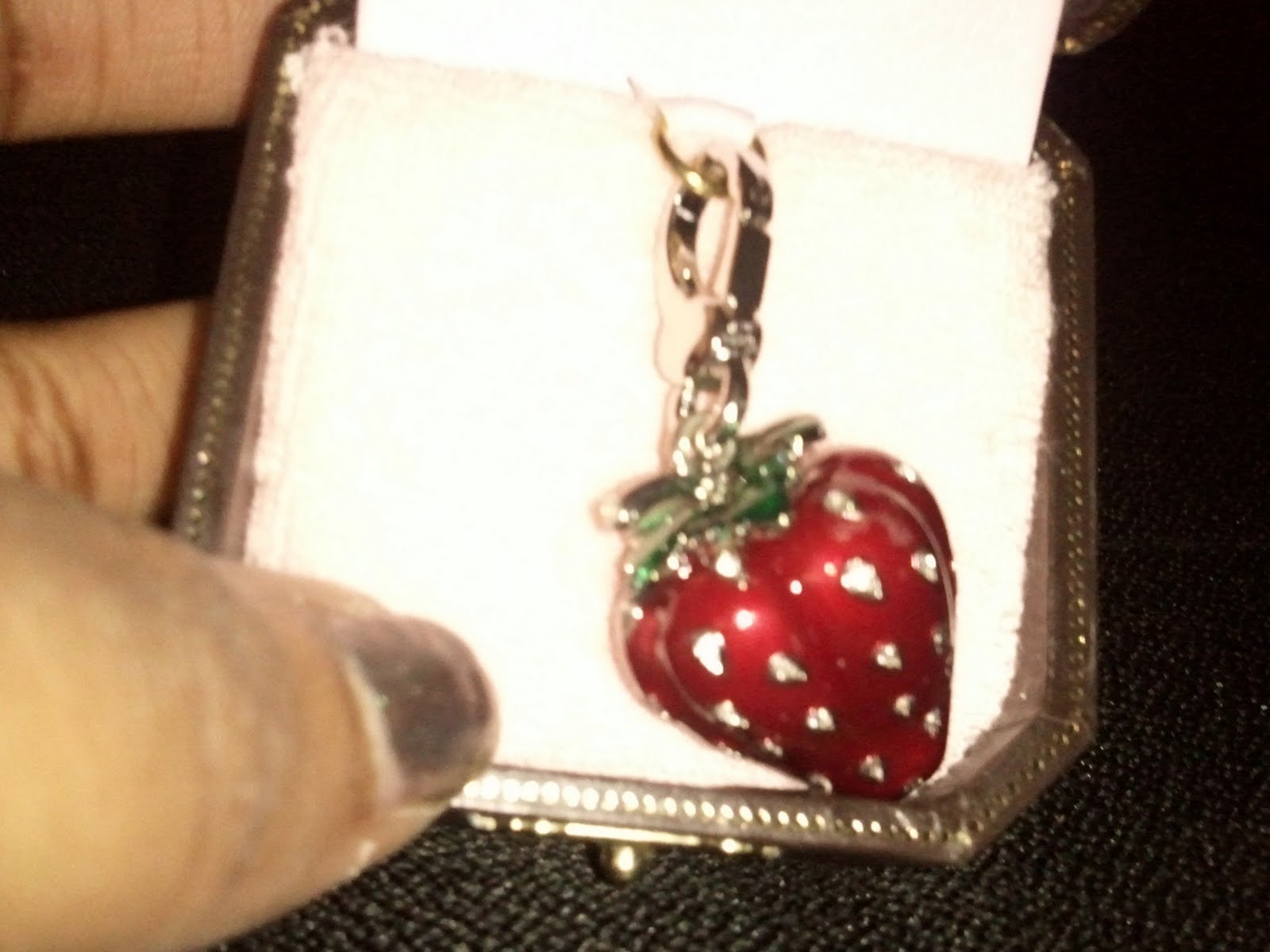 Of course you are supposed to build your bracelet with charms for special occasions I believe so being the big spender that I am *hangs head in shame,* I wasted no time and purchased a charm. The first charm to grace my bracelet is this diamond (doubt they are real) poked strawberry. The reason…well there are so many but a friend of mine said it was the closet thing that matched my personality. I think she is right…strawberries are indeed the best, although its not my favorite fruit…go figure lol.